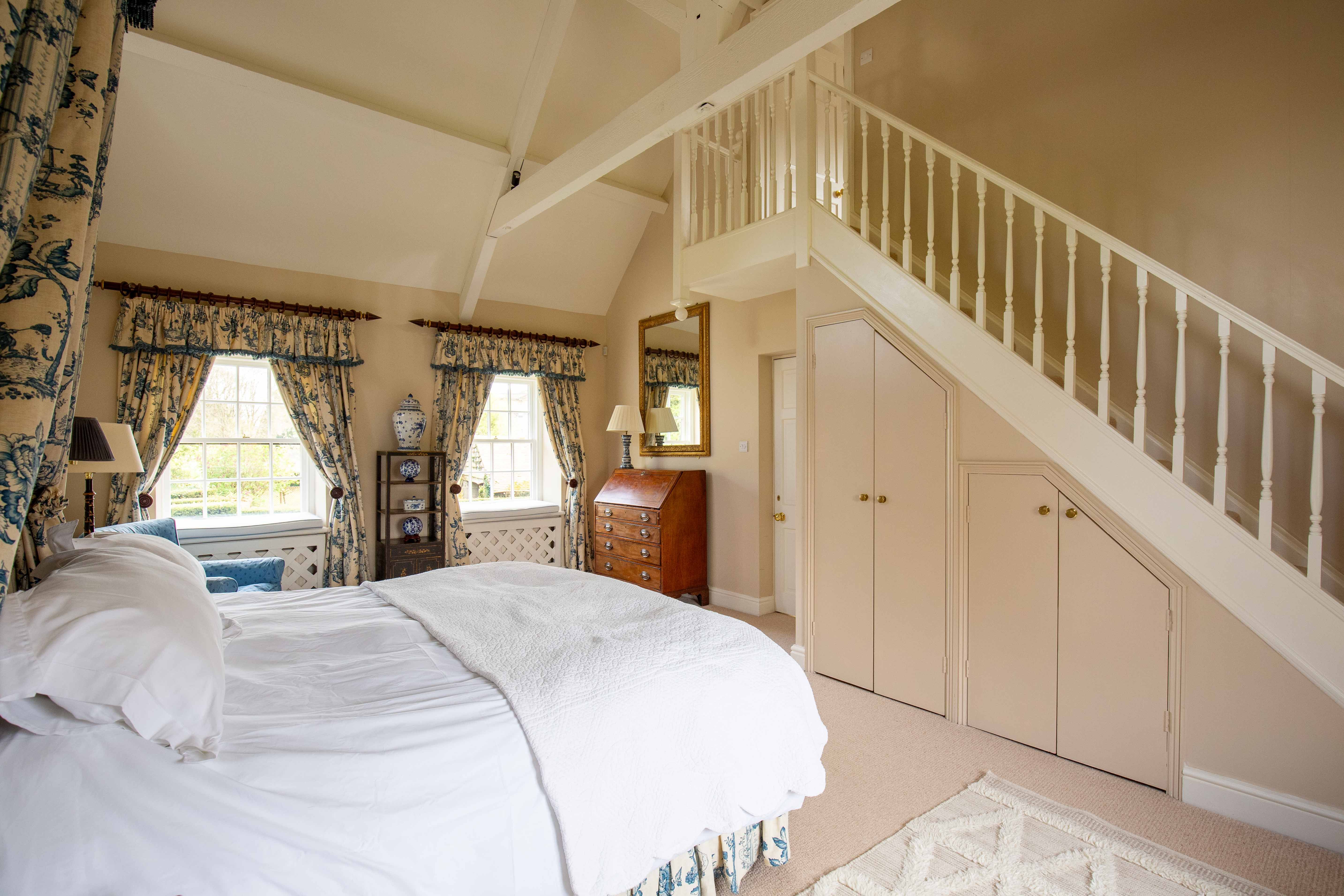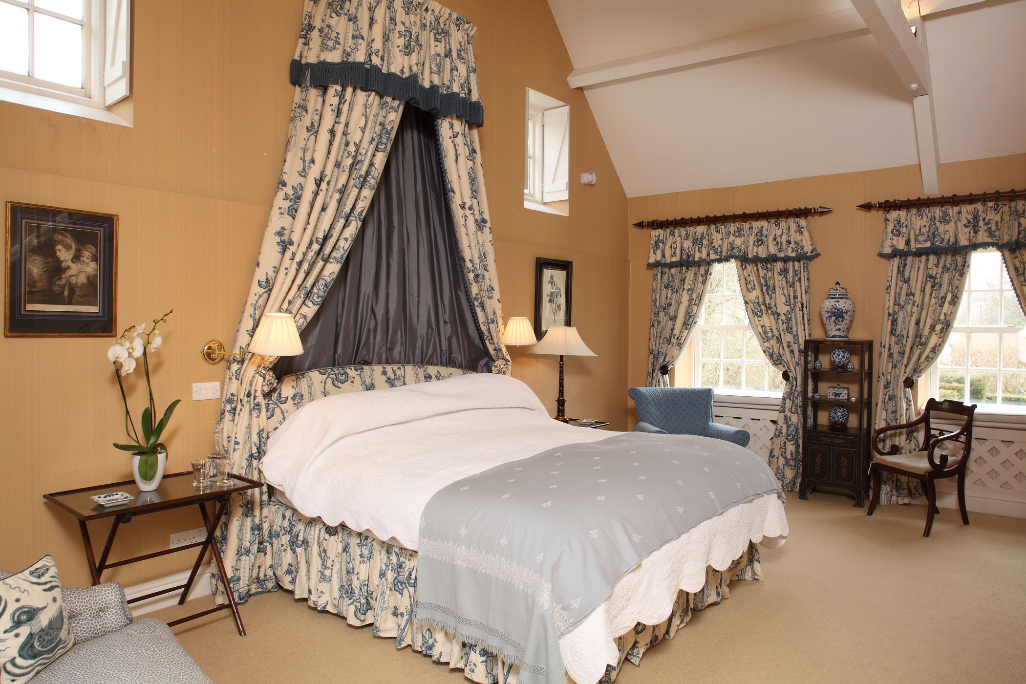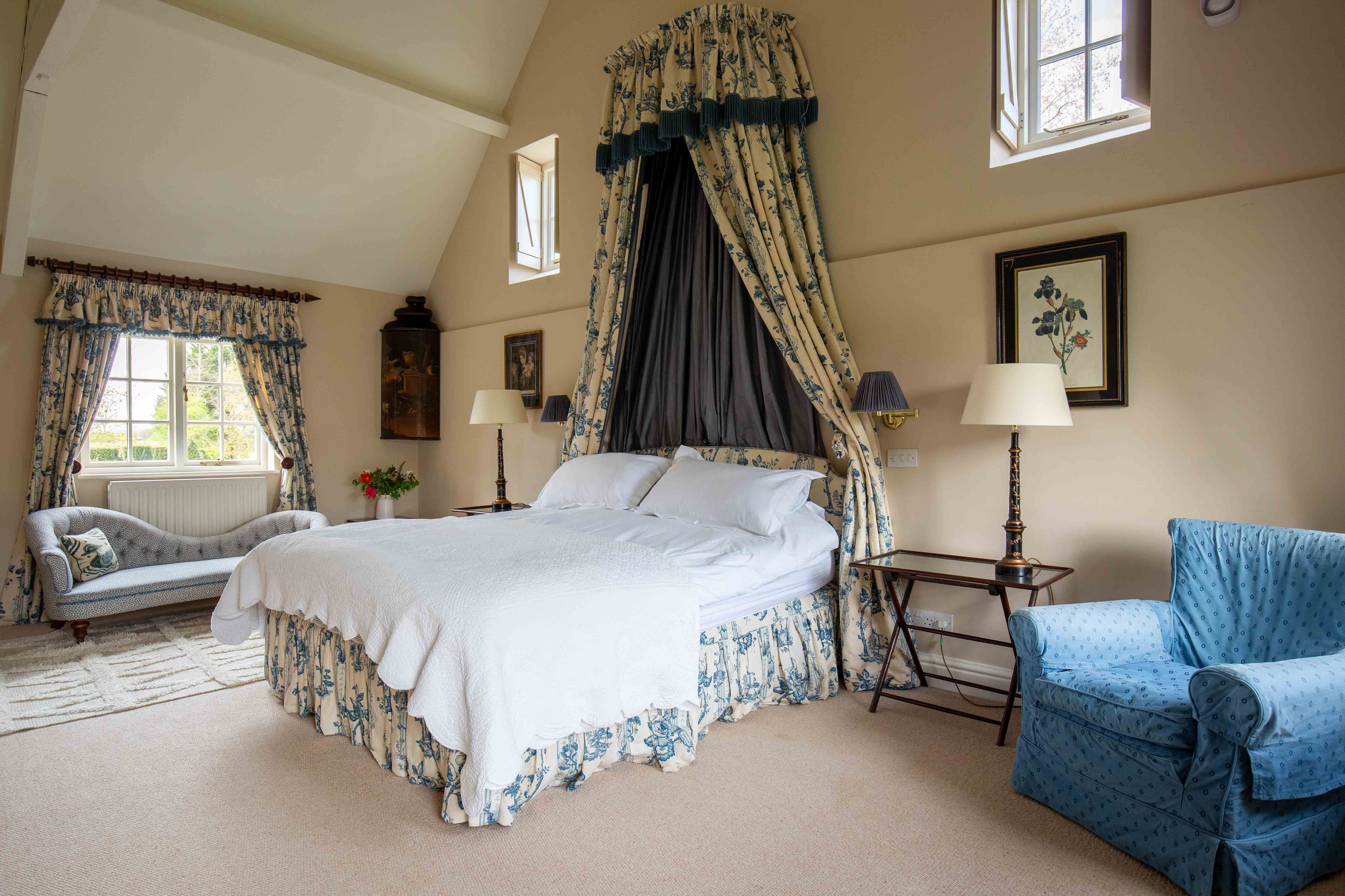 The fifth bedroom is large and magnificent, with a high pitched ceiling and an impressive six foot wide half tester bed, hung in a blue and white Colefax and Fowler toile de jouy.  The walls are a Farrow and Ball tobacco brown, and the furniture upholstered and covered in blues and off whites.