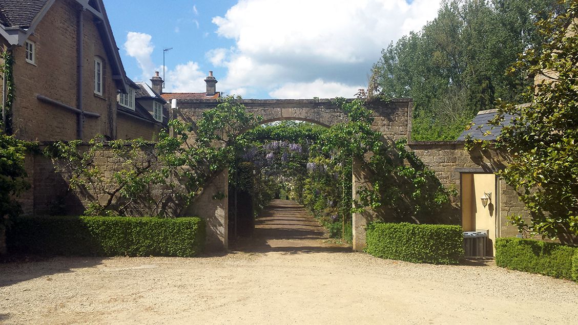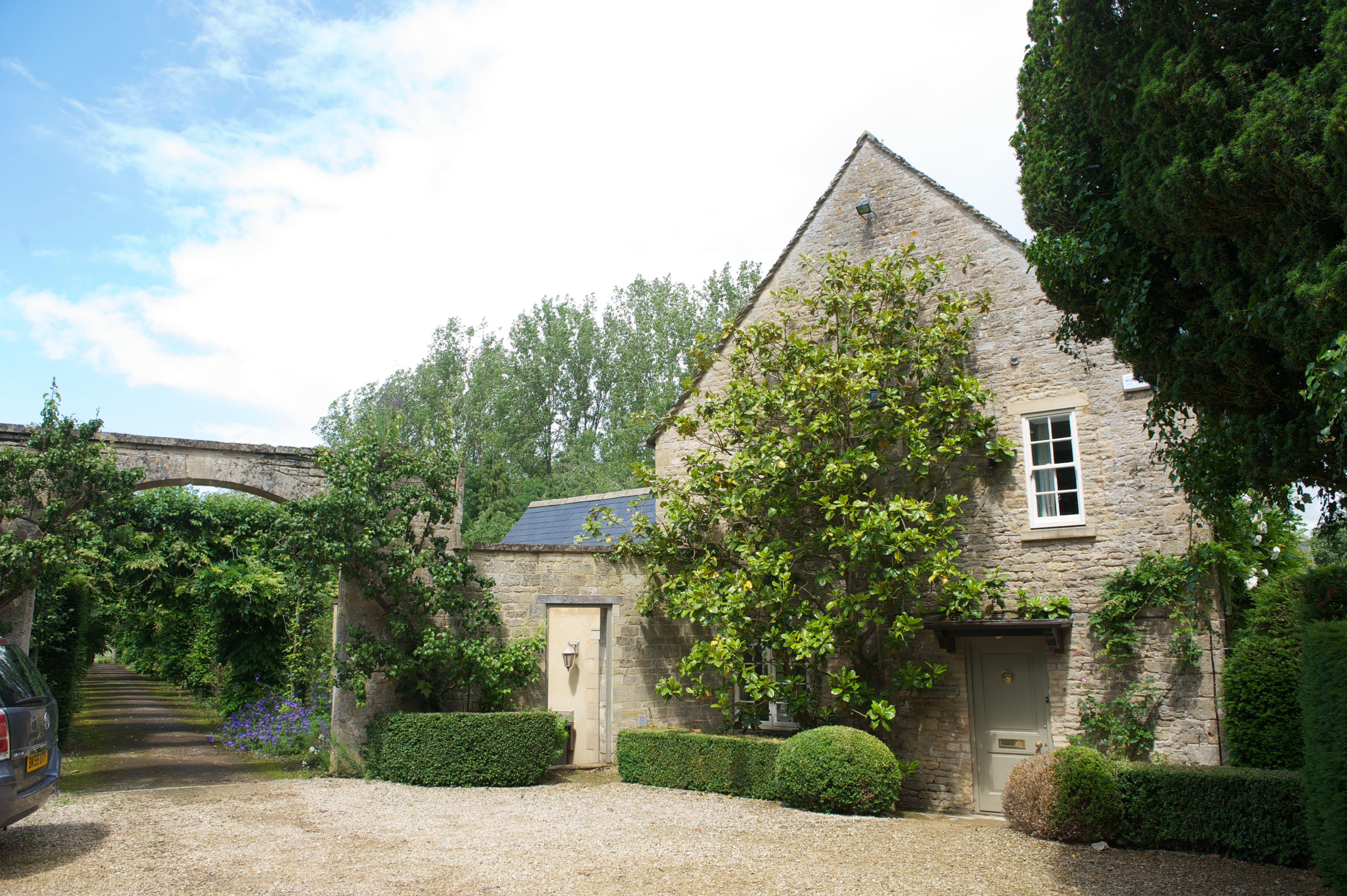 The private drive to Weir House is flanked by yew hedges, and leads to a formal gravelled forecourt with box hedges and topiary, and a huge magnolia growing up over the front door.