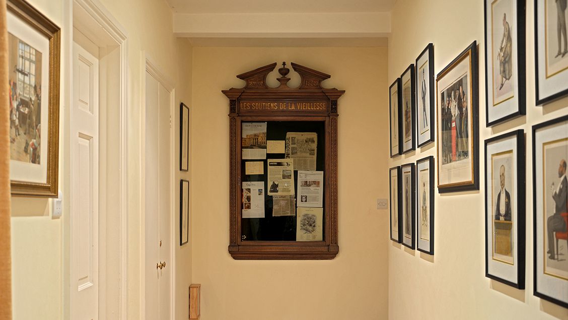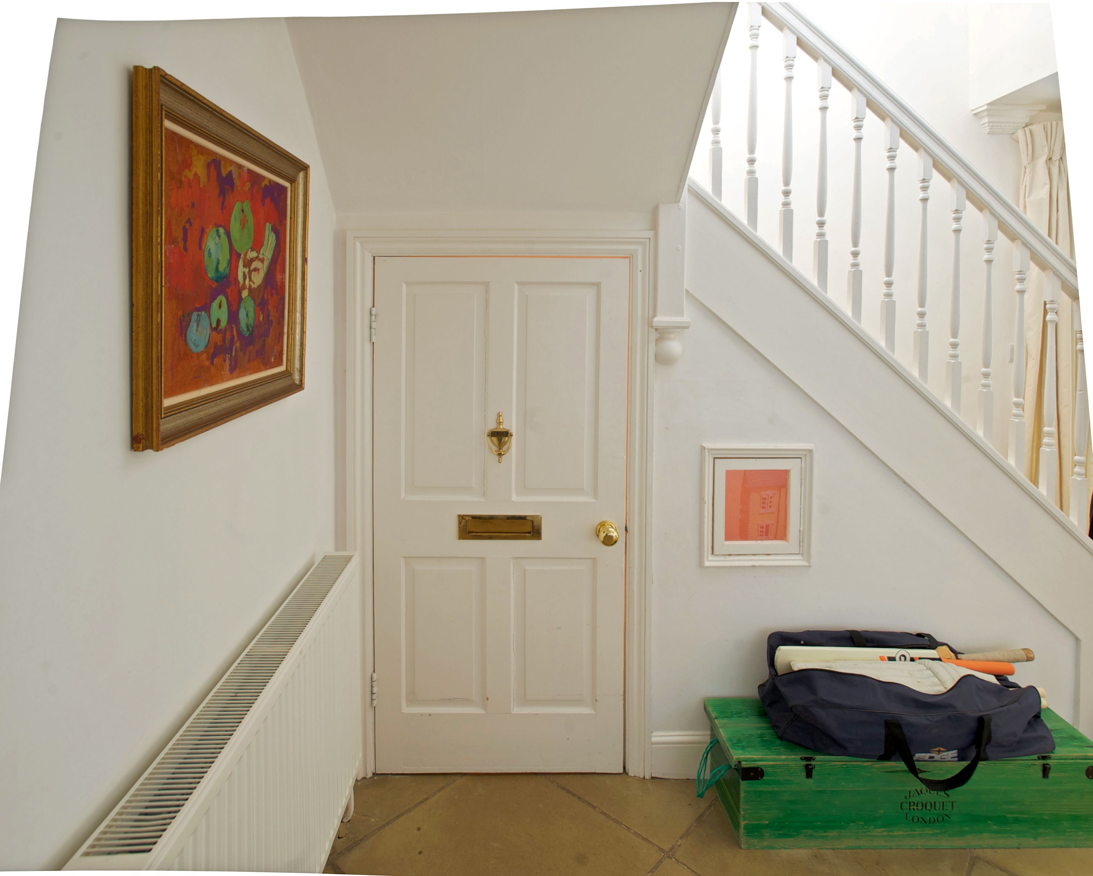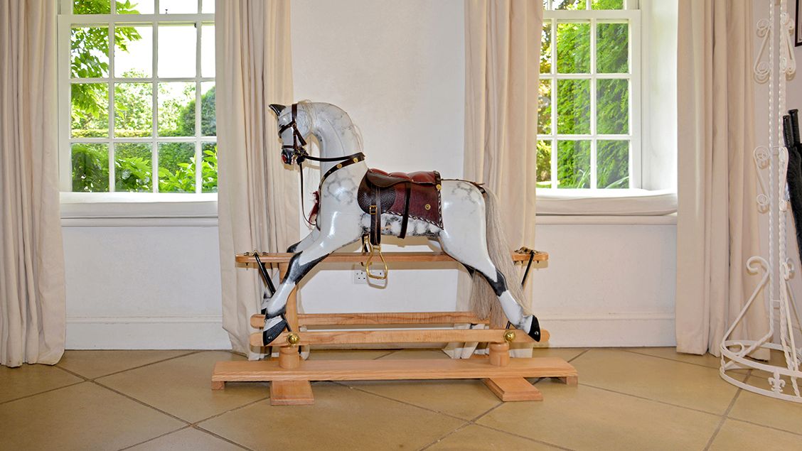 There is a flagged entrance hall with stairs leading up to a galleried landing lit by a round oeil de boeuf window and a large hall lantern.  There’s a much loved rocking horse, a doll’s house in a little alcove in the hall, and under the stairs, the children’s den, with dressing-up clothes and a puppet theatre.  Two windows look out onto the croquet lawn, and a door on the left opens into the dining room, which has a ten-foot antique pine-topped table and a massive sideboard.