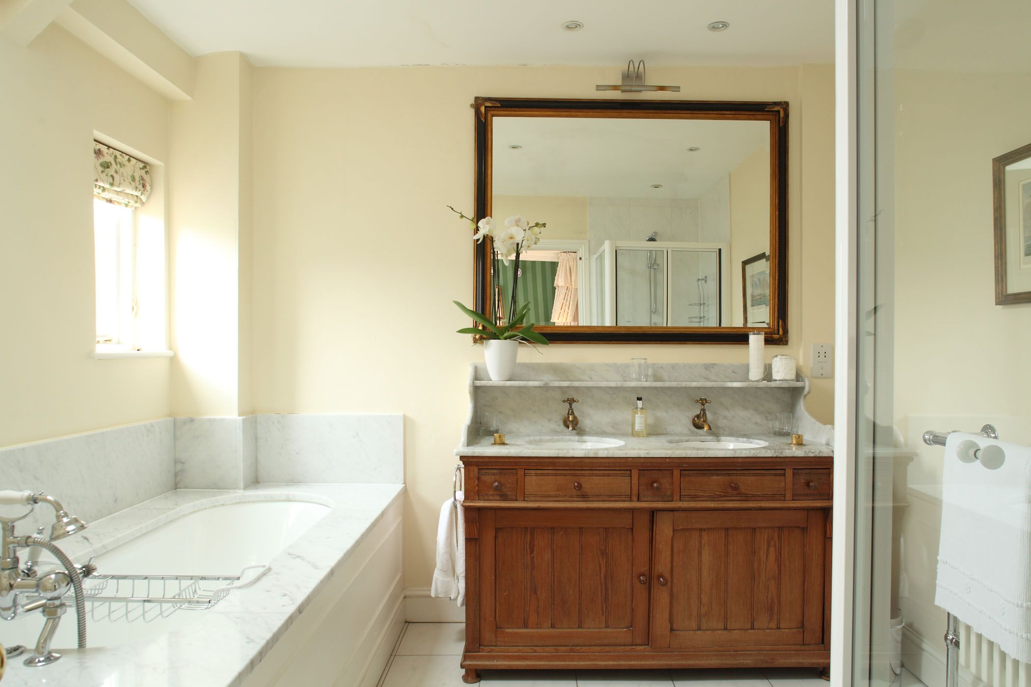 The other two bedrooms are on the first floor, up the stairs from the hall.  They occupy the full width of the house, with windows facing in both directions.  The twin room is wallpapered in a deep green stripe offset by white bed hangings, white curtains on the four windows, and a white chaise longue.  It is furnished with handsome antiques a campaign wardrobe with brass cockbeading along the pediment, two mahogany bedside tables and a nineteenth century campaign chest.  We think of it as the Empire room.  It has an en-suite bathroom, tiled in Carrara marble to match the top of a twin basined antique French pitch-pine vanity unit.  (It’s a very rare piece and was a nightmare to plumb in).  There’s a Carrara marble surround and splash-back round the bath, and a separate tiled shower enclosure.