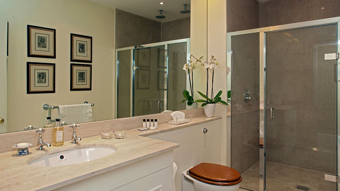 A door to the left of the fireplace leads into a corridor, off which open the three downstairs bedrooms.  They all have en-suite bathrooms or shower rooms.  The double room, the first on the right of the corridor, has a French door leading out onto the South terrace.  The magnificent king-size four-poster, faces the South terrace. The walls are painted a Farrow and Ball ochre.  There’s a sofa and a chair at the desk: it’s a good place to retreat to when there’s a lot going on elsewhere.  The en-suite shower, tiled in buff marble to match the top of the vanity unit, has a shower big enough for two.  Next door is a ravishing twin room with a distinctly French feel: the two nineteenth century French beds and the Louis XVI chair are upholstered in a red and white Colefax and Fowler toile de jouy to match the curtains.  The walls are grey, and there’s a sparkling Venetian glass mirror over the bureau.  Its en-suite shower room is tiled in grey and white Carrara marble.  The third, with two windows and a French door facing west onto the north terrace, has twin mahogany four-posters dressed in a Colefax and Fowler print of yellow roses on beige and off-white striped background and a beautiful nineteenth century secretaire.  The walls are a sludgy Farrow and Ball grey-green and the curtains off-white.  Like the other two, it has a comfortable sofa and chair and a writing table. The ensuite bathroom is tiled in beige marble: the bath has a Niagara tap and an overhead shower.