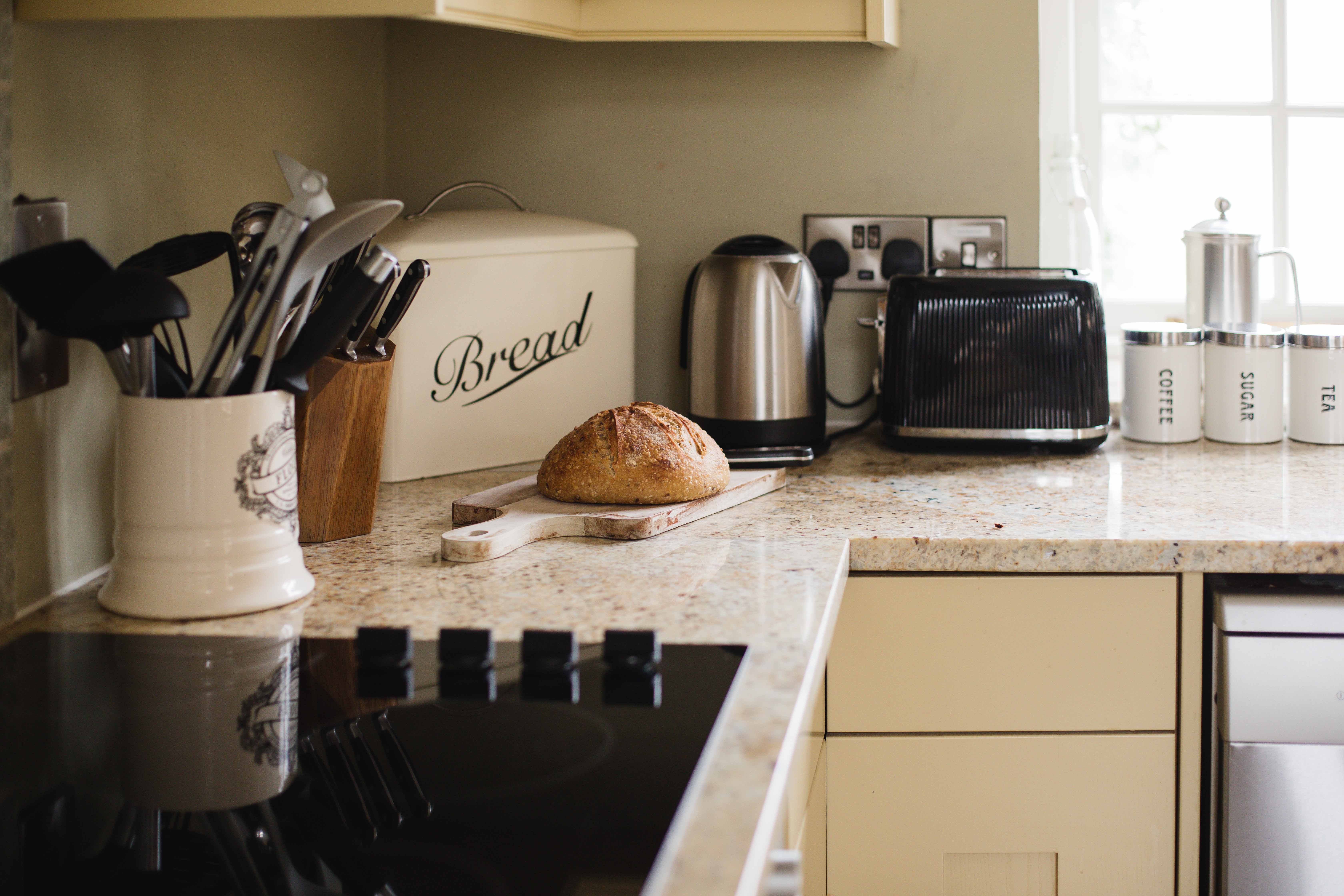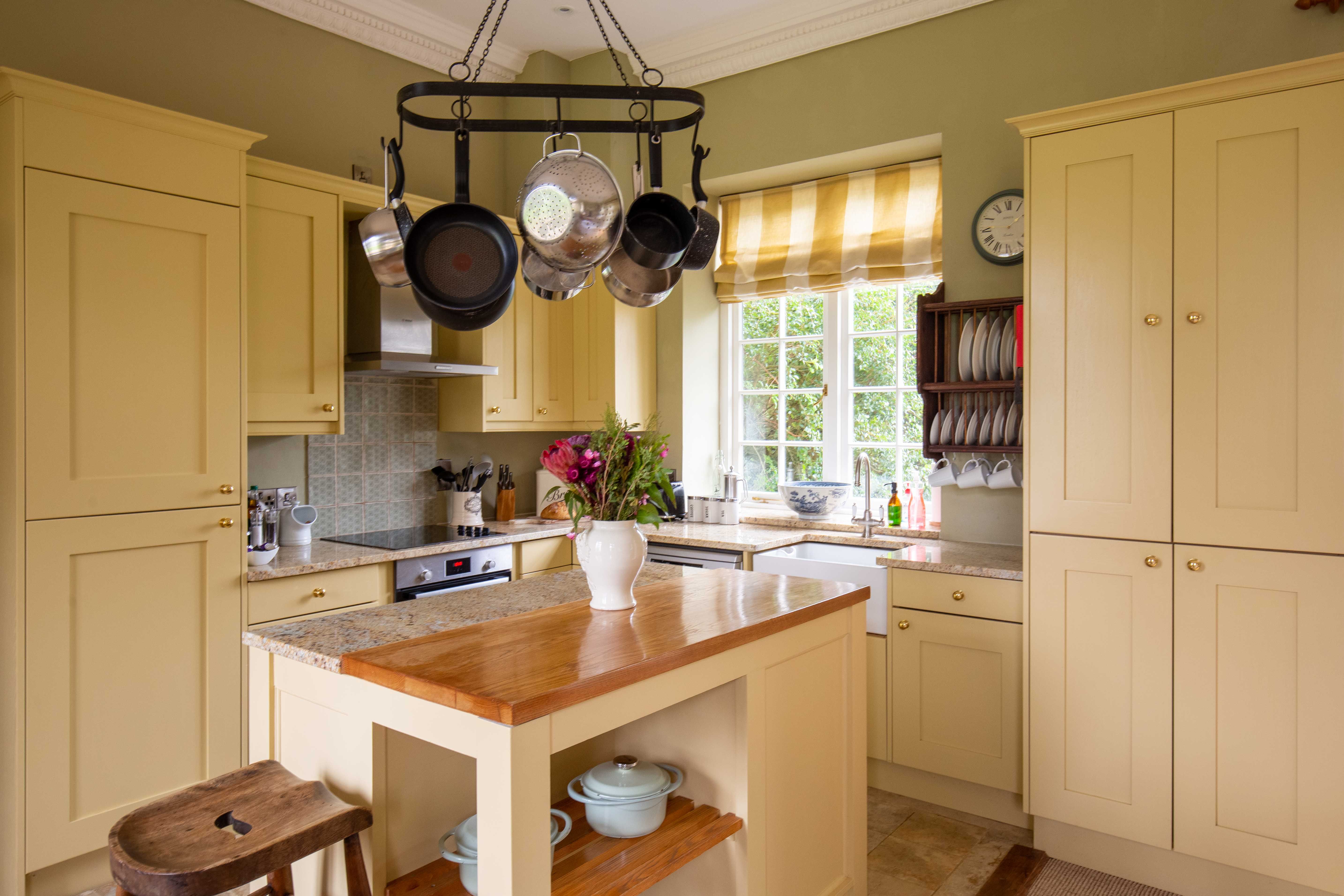 The kitchen area is paved with pale terracotta tiles laid diagonally, and the centrally placed pine island unit, which houses the microwave, is surfaced half in granite and half in pine, with sockets built-in for appliances. Over it hangs an oval wrought iron rack for saucepans and utensils. The units are painted warm ivory, and topped with brown granite, and there’s a row of highly decorative Mason’s Ironstone plates above.