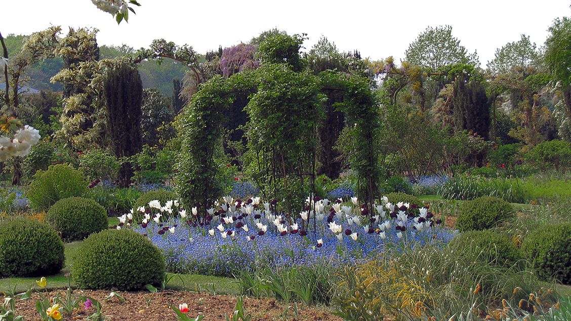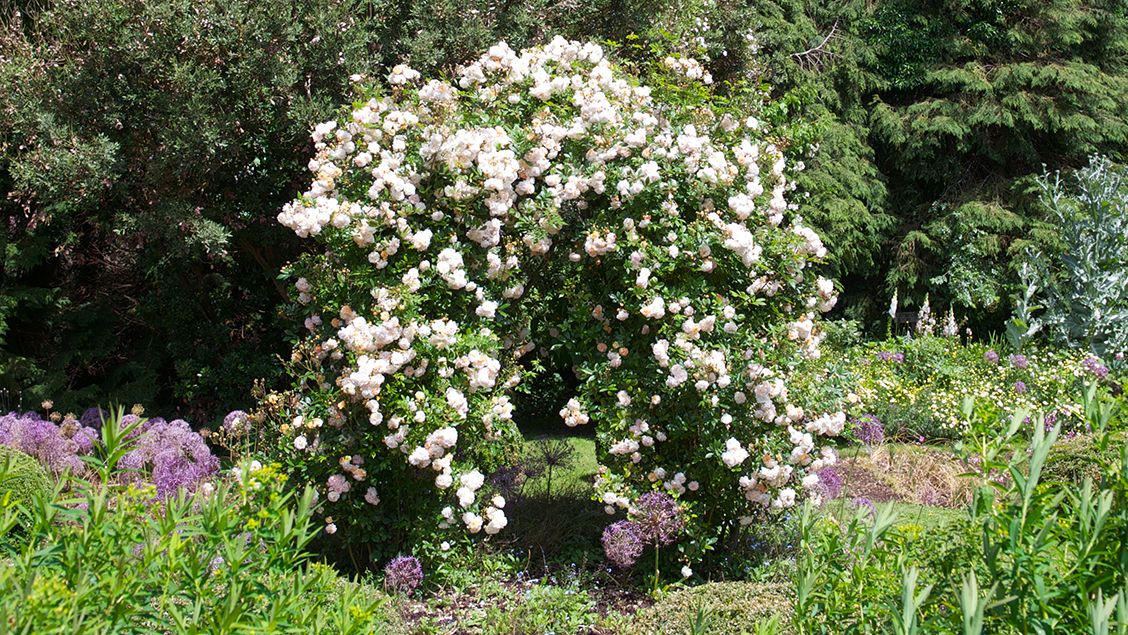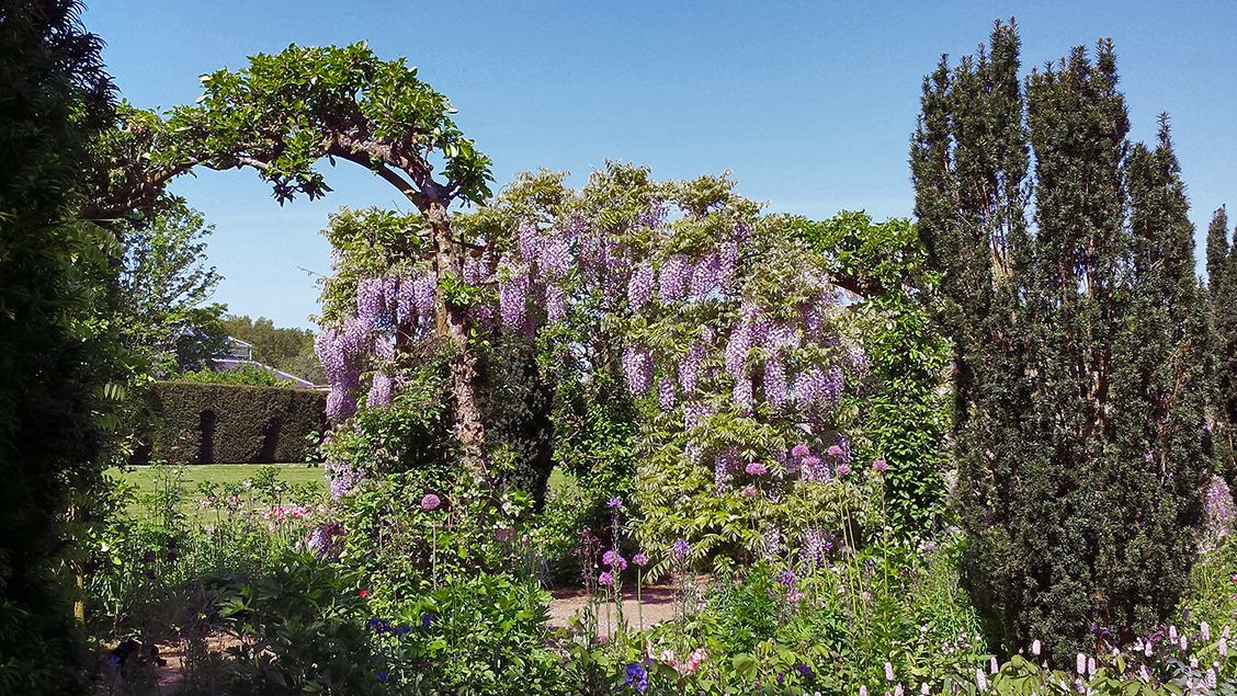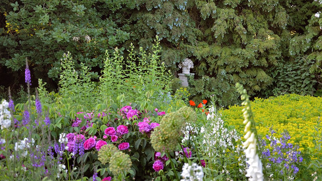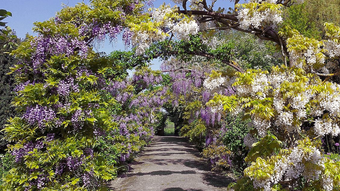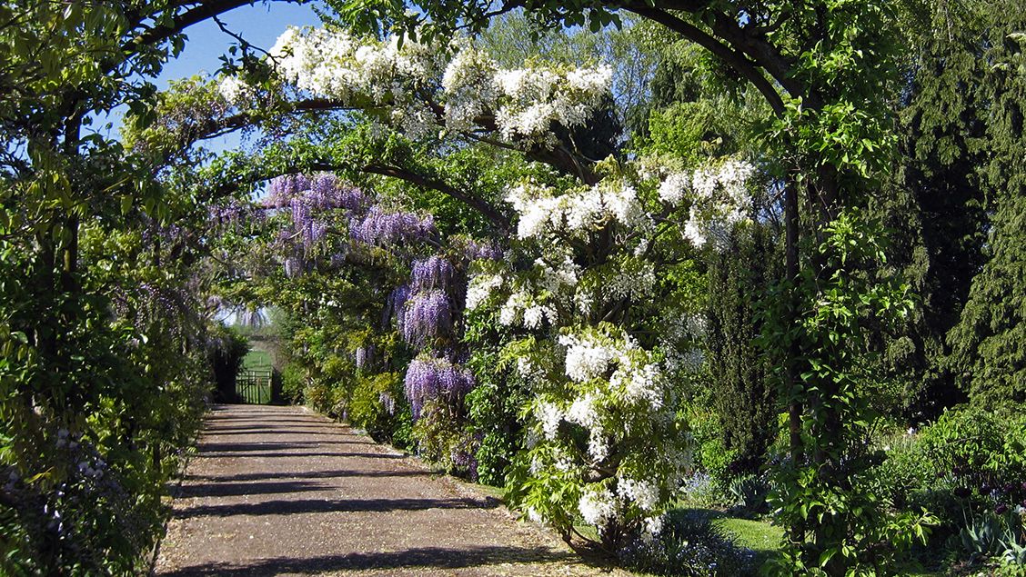 The Long Border, a misty, opalescent mix of mauves, crimsons, pinks and white, is breathtaking in its sweep and scale. Behind it is another tour de force, a tunnel of wisteria and apple trees, trained on arches, which runs the length of the garden. In spring apple blossom gives way to heavily scented wisteria, humming with bees; summer brings a froth of purple and crimson viticella clematis, and in autumn rosy apples cluster on the trees, ripe for picking. On the other side of the apple and wisteria tunnel, you find the cutting garden where we grow the flowers for the holiday cottages, a formal parterre centred on a wrought iron gazebo covered in rambler roses. Its neatly edged beds, immaculate grass paths and clipped box balls are a counterpoint to the explosion of colour they contain – magenta, purple, scarlet, orange, brilliant blue and lime green. Only the symmetry of the Irish yews, which mirror those at the back of the Long Border, links the two sides of the tunnel.