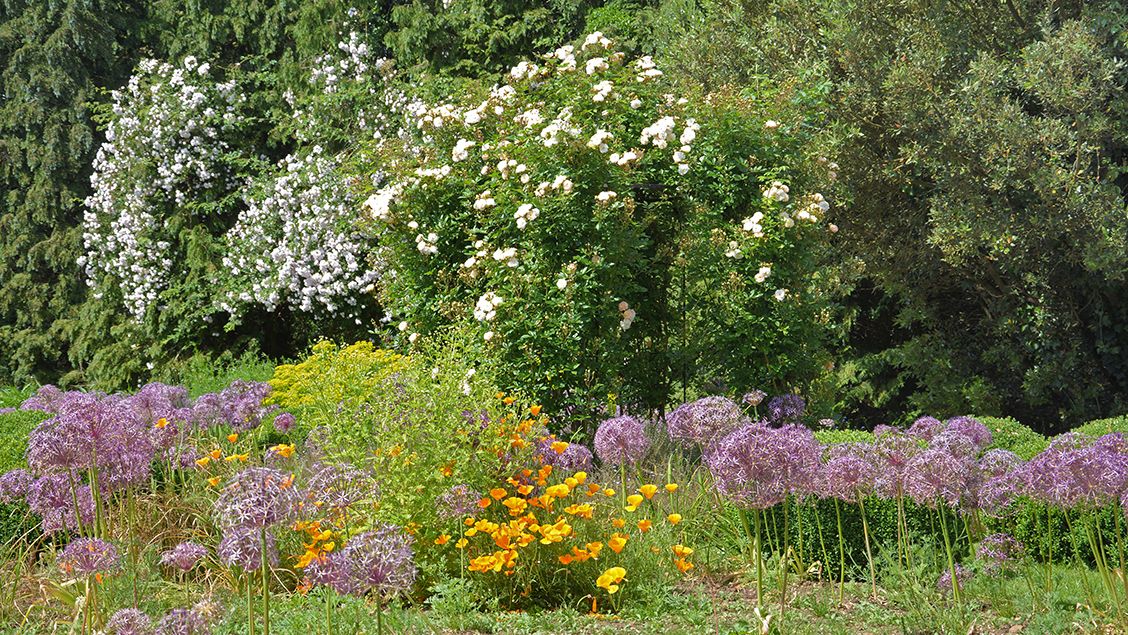 In total contrast again is the walk by the stream towards the Games Room, a lush, natural planting of shade lovers: hellebores, sweet rocket, foxgloves, Solomon’s seals, ferns, hostas, primulas and daylilies, with every now and then plants on abigger scale like gunneras, bamboo, giant rhubarb and species roses.